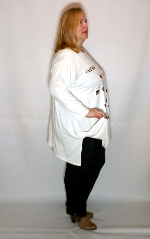 Удлиненная туника А-силуэта выполнена из высококачественного, трикотажного полотна с 95% содержанием вискозы.