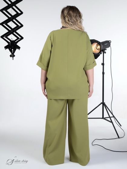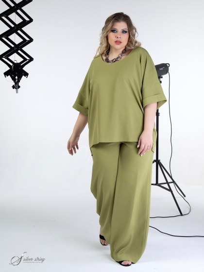 Элегантный блузон Т-образного силуэта выполнен из высококачественного материала с эластаном. Изделие с рукавом покроя кимоно, длиной 3/4. Низ рукава оформлен отворотом. Линия горловины округлой формы. Низ изделия асимметричной формы: спинка удлинена относительно полочки. В модели учтены особенности фигуры дам нестандартных размеров.