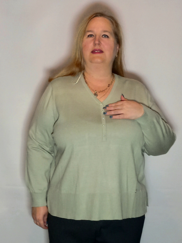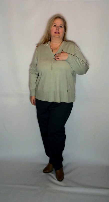 Вязаный оливковый джемпер свободного силуэта с V-образным вырезом. Втачной рукав. Эластичный широкий пояс и манжеты с более мелкой вязкой на растяжение. Модель выполнена из вискозы с добавлением модала, полиэстера. Планка декорирована исскуственным жемчугом.Отлично сочетается с классической прямой юбкой и брюками.