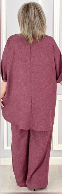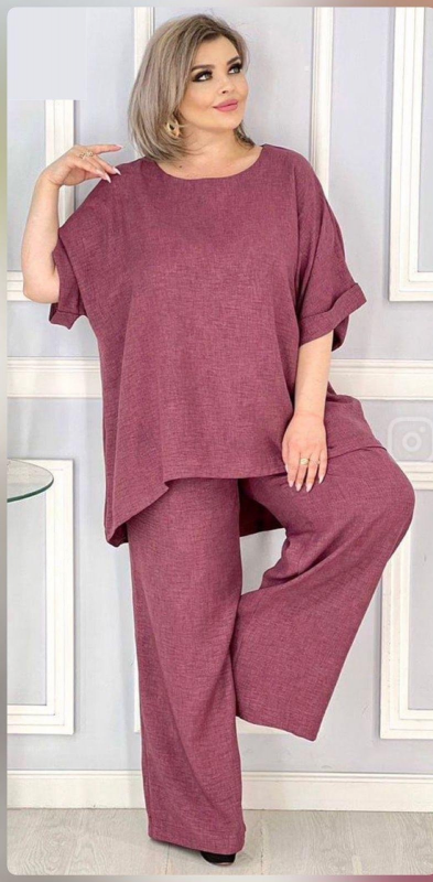 Элегантный, свободный, летний костюм выполнен из ткани сингапур. Ткань легкая, тонкая, но не рыхлая, с эффектом жатости, умеренно эластичная ( в составе есть небольшое содержание хлопка).