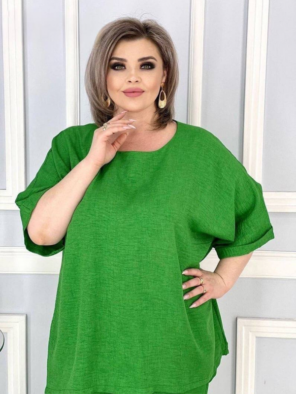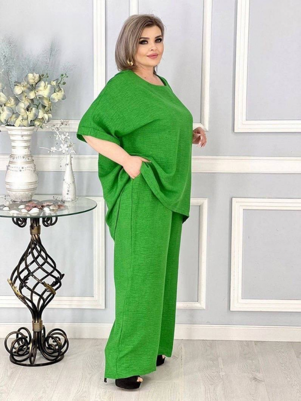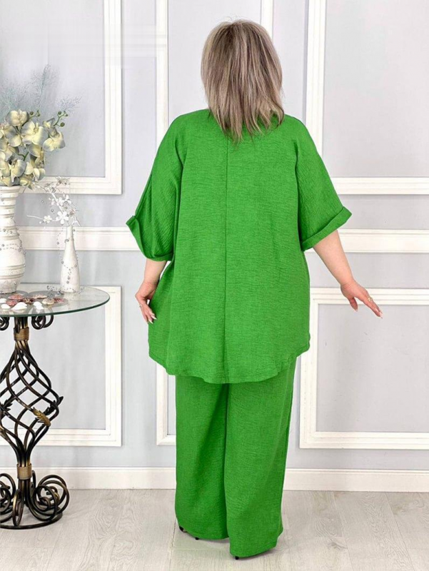 Элегантный, свободный, летний костюм выполнен из ткани сингапур.  Ткань  легкая, тонкая, но не рыхлая, с эффектом жатости, умеренно эластичная ( в составе есть небольшое содержание хлопка).