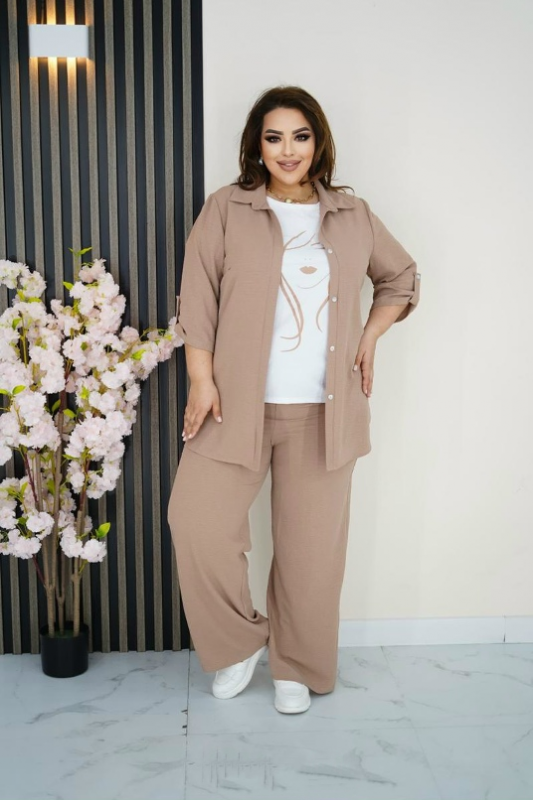 Костюм выполнен  ткани сингапур. Ткань  легкая, тонкая, но не рыхлая, с эффектом жатости, умеренно эластичная ( в составе есть небольшое содержание хлопка). Состоит из удлиненной рубашки, топа и брюк.