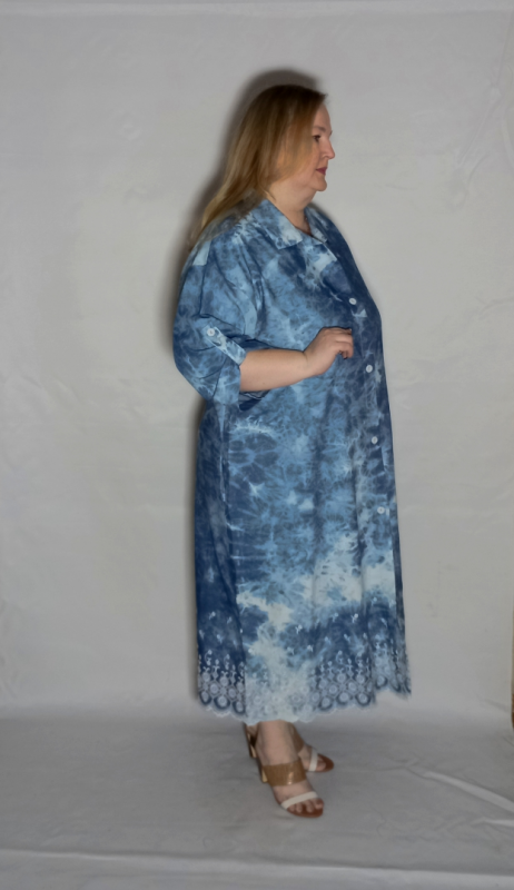 Шикарное   платье из  облегченной, рубашечной джинсы с эффектом "варенки"  и вышивкой по низу платья и рукавов.