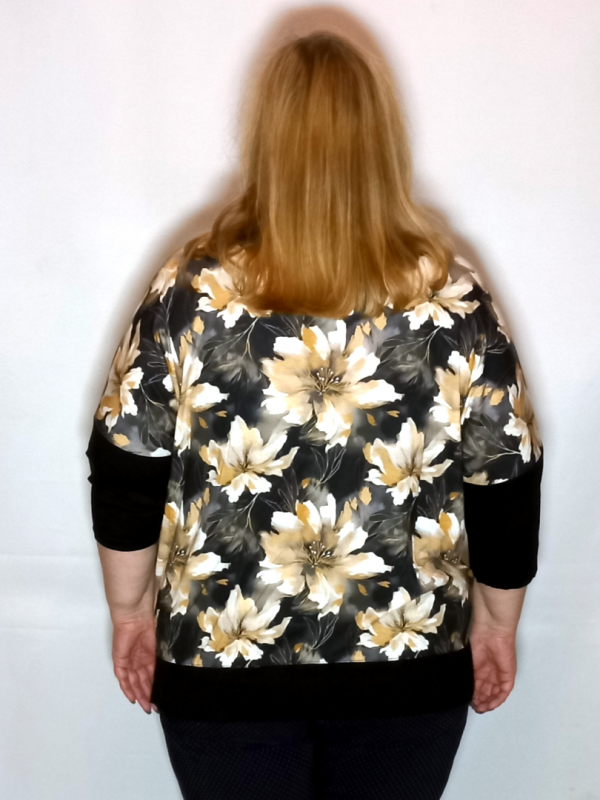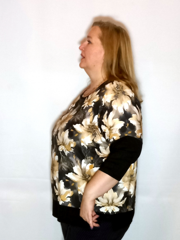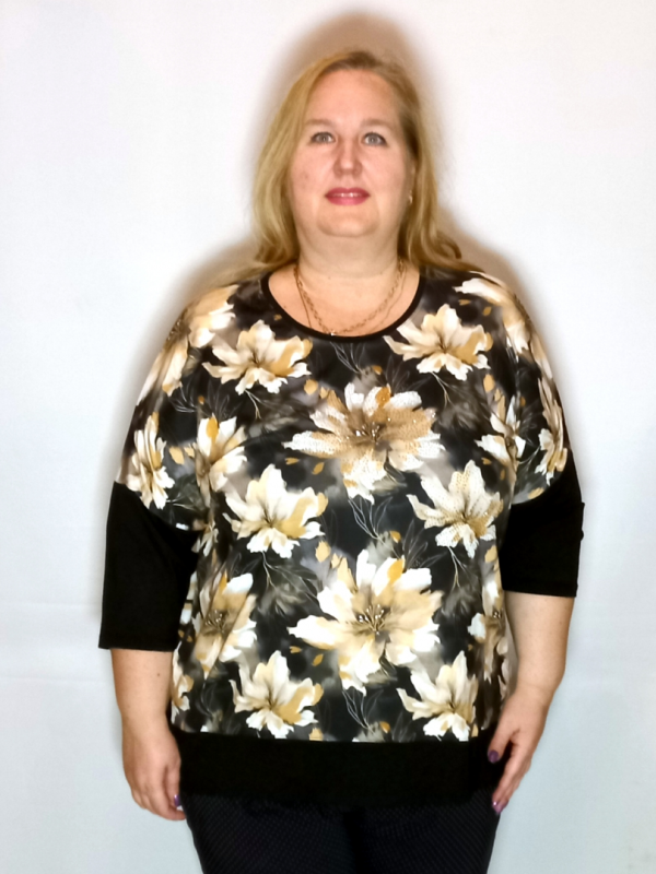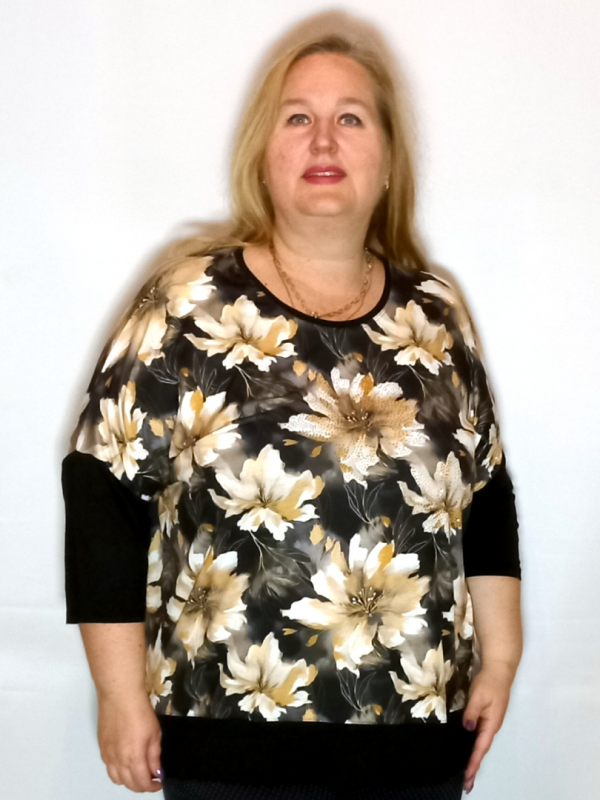 Рукав 3/4, спущенное плечо, нижняя часть из однотонного трикотажа.