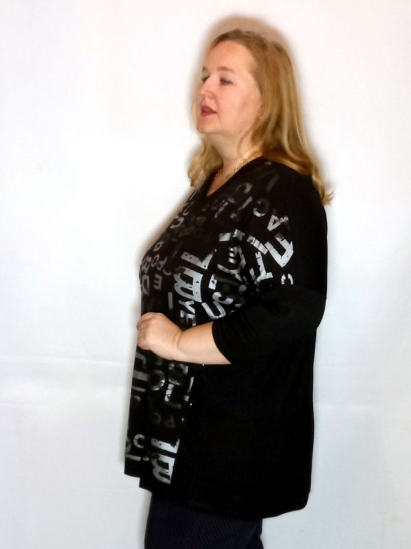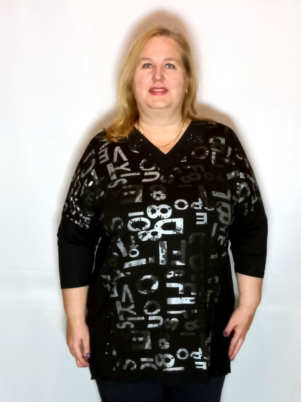 Полочка сложнокроенная: боковые вставки черного цвета, декорированы черными термостразами. Средняя часть полочки из принтованного трикотажа.