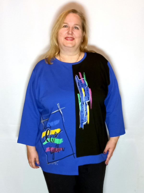 Туника выполнена из более плотного ,хлопкового трикотажа. Приятный к телы, умеренно эластичный за счет спандекса.