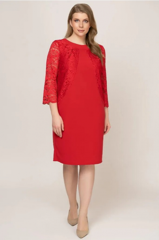 Эффектное платье, выполненное в комбинации плотного трикотажа и ажурного гипюра. Модель длиной до колен, чуть заужена книзу. С круглым вырезом горловины. Крой и игра фактур имитируют кружевное болеро с втачным рукавом 3/4.